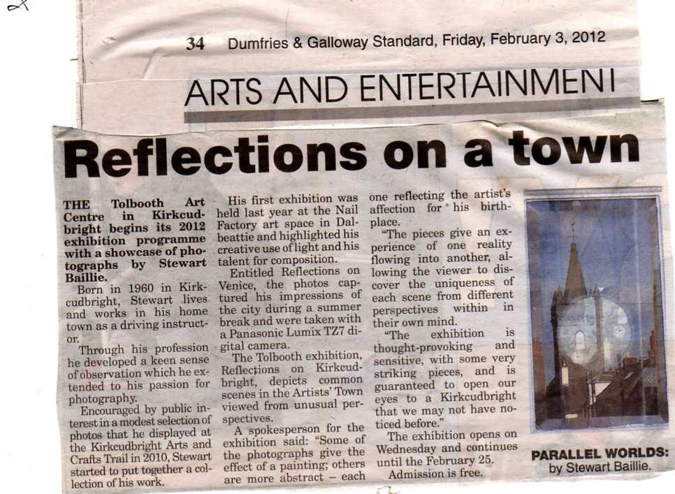 Encouraged by public interest in a modest selection of photos that he displayed at the Kirkcudbright Arts and Crafts Trail in 2010, Stewart started to put together a collection of his work. His first exhibition was held last year at the Nail Factory art space in Dalbeattie and highlighted his creative use of light and his talent for composition. Entitled Reflections on Venice, the photos captured his impressions of the city during a summer break, and were taken with a Panasonic Lumix TZ7 digital camera.